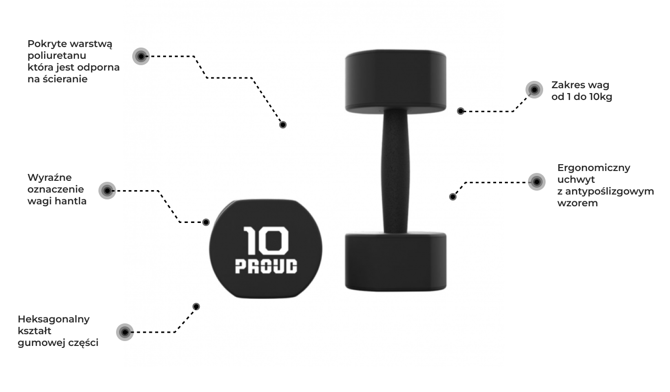 ZASTOSOWANIE: Hantle poliuretanowe Studio PROUD są przeznaczone do różnorodnych zastosowań, od domowych siłowni po profesjonalne centra sportowe. Idealnie sprawdzają się zarówno w treningu fitness, jak i na siłowniach, oferując użytkownikom nie tylko efektywny, ale i bezpieczny trening.