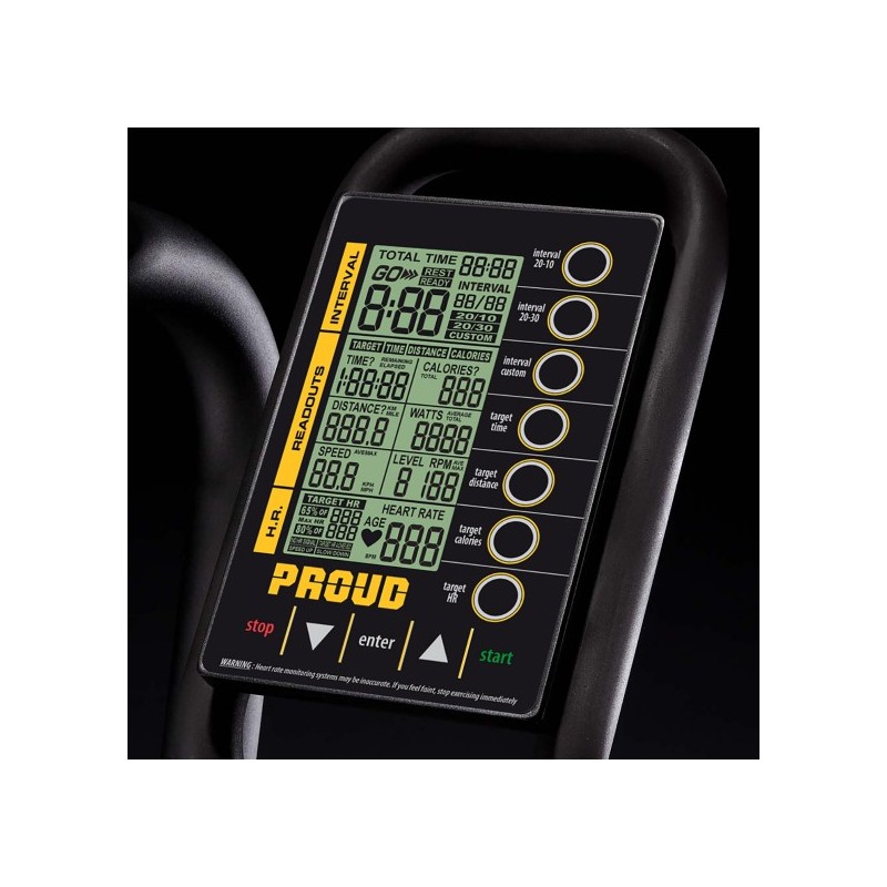 - duży ekran LCD wyświetlający 6 odczytów treningu: czas, obroty na minutę, prędkość, dystans, kalorie, energia