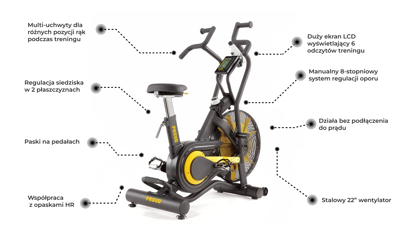 ROWER TRENINGOWY AIR BIKE 2.0 ELITE PROUD to rower bezsilnikowy, który nie wymaga podłączenia do prądu, dzięki czemu można go ustawić w dowolnym miejscu strefy treningowej. Działa na zasadzie oporu powietrza. W ruch wprawia go siła, z jaką naciskamy na pedały. Im szybciej pedałujemy, tym większy uzyskujemy opór i więcej spalamy kalorii. W odróżnieniu do wersji Standard rower posiada manualny 8-stopniowy system regulacji oporu, który pozwala na intensyfikację treningu, która przyspiesza budowanie siły i wytrzymałości.