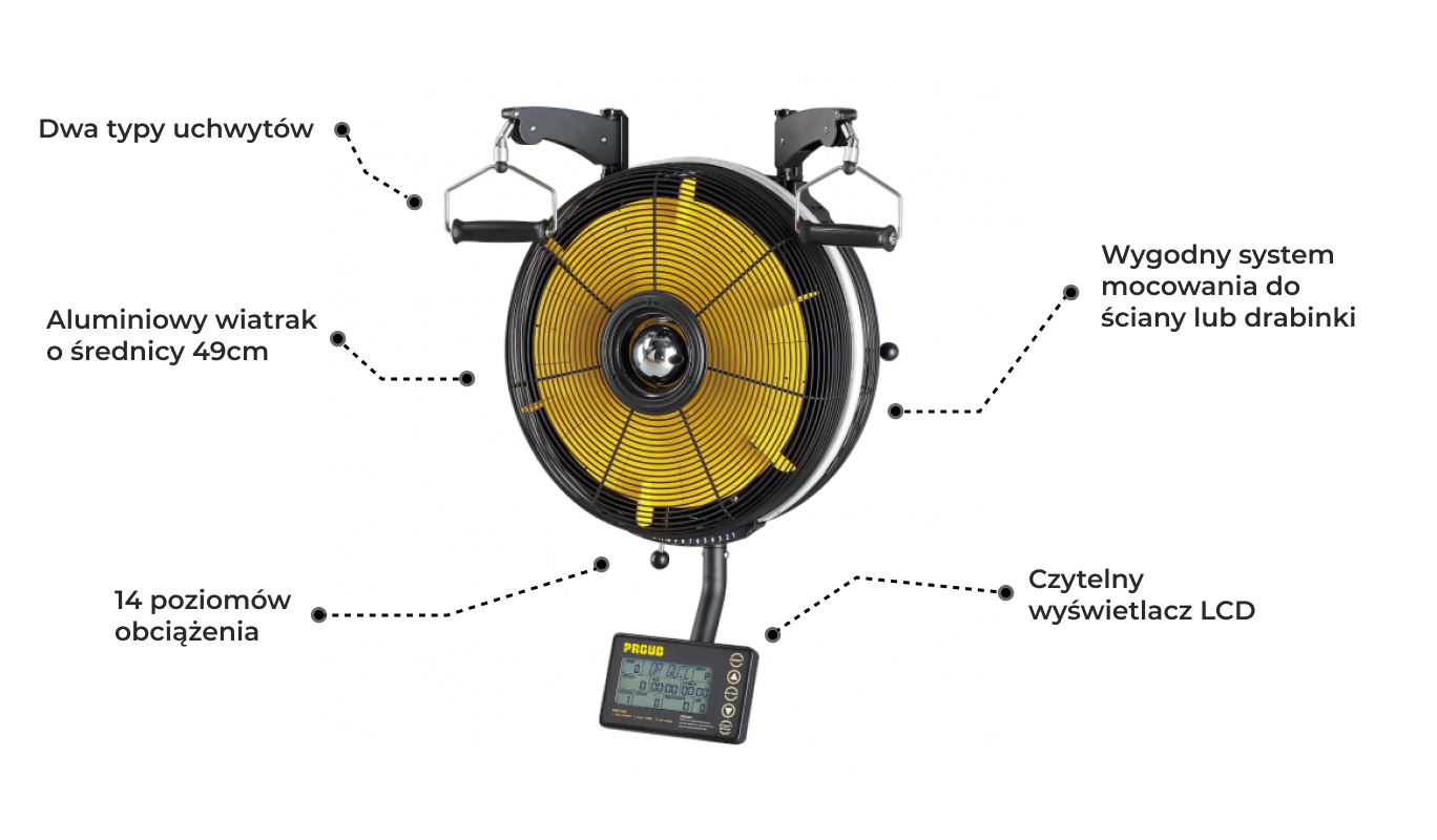 Urządzenie wyposażone jest w różnorodne programy treningowe, które umożliwiają zróżnicowane i ukierunkowane ćwiczenia. Wygodny uchwyt "quick release" umożliwia szybką zmianę uchwytów i przełączanie się między programami treningowymi, zapewniając elastyczność w planowaniu treningu. Duży podświetlany wyświetlacz LCD gwarantuje czytelność danych podczas wysiłku. Ponadto, urządzenie nie wymaga podłączenia do źródła zasilania, zapewniając pełną swobodę użytkowania i ochronę środowiska.