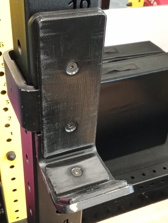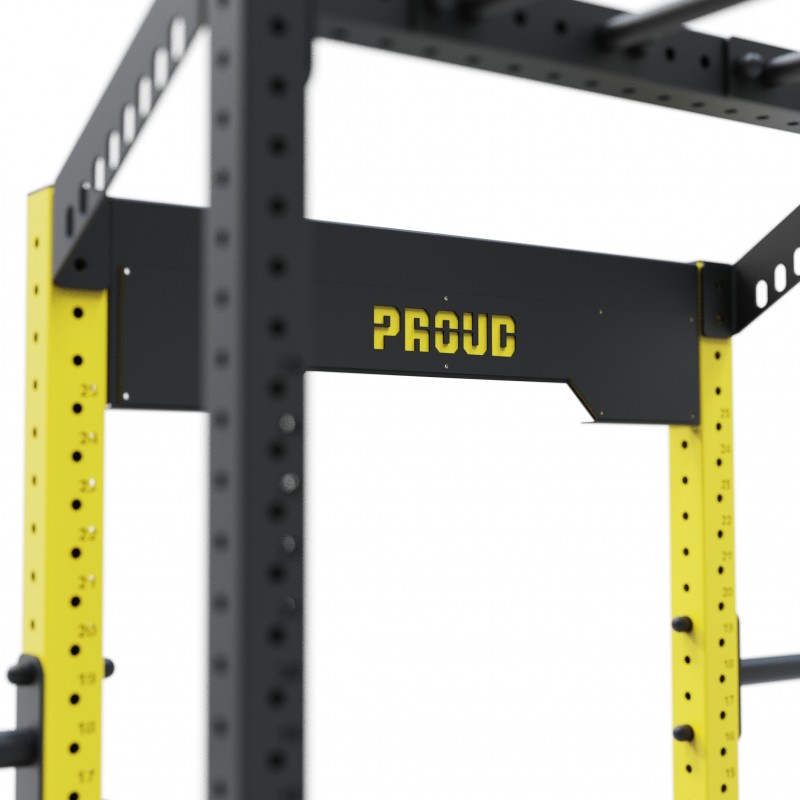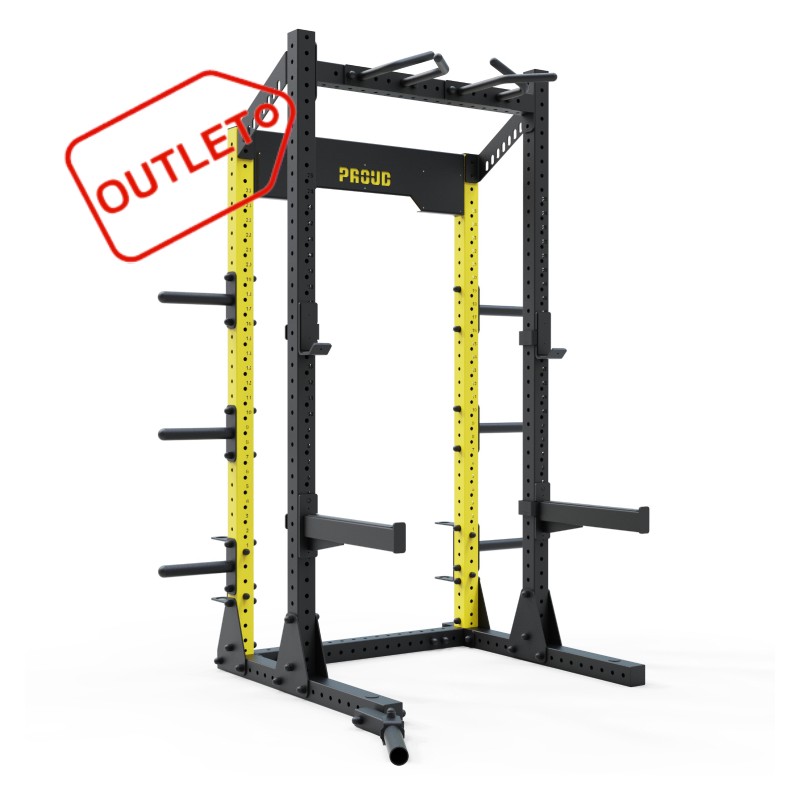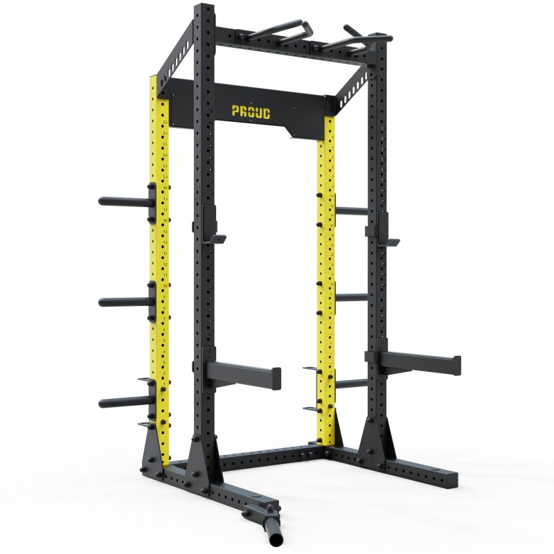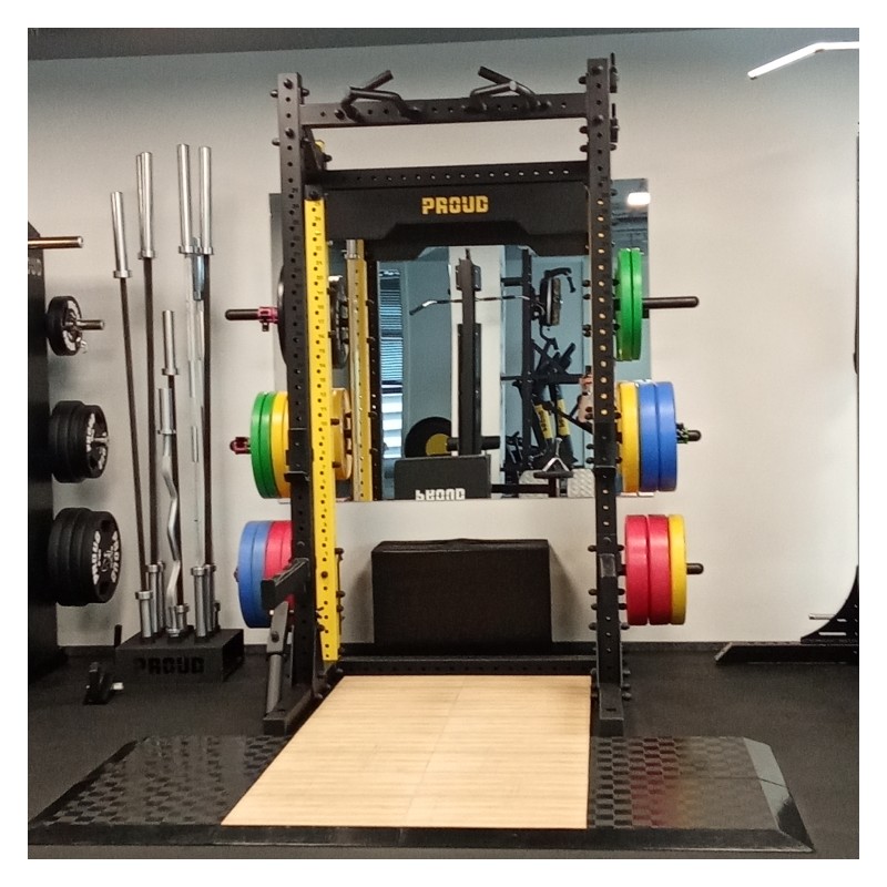 Klatka wzbogacona o uchwyt typu landmine, miejsca do przechowywania obciążenia olimpijskiego oraz gryfów olimpijskich.