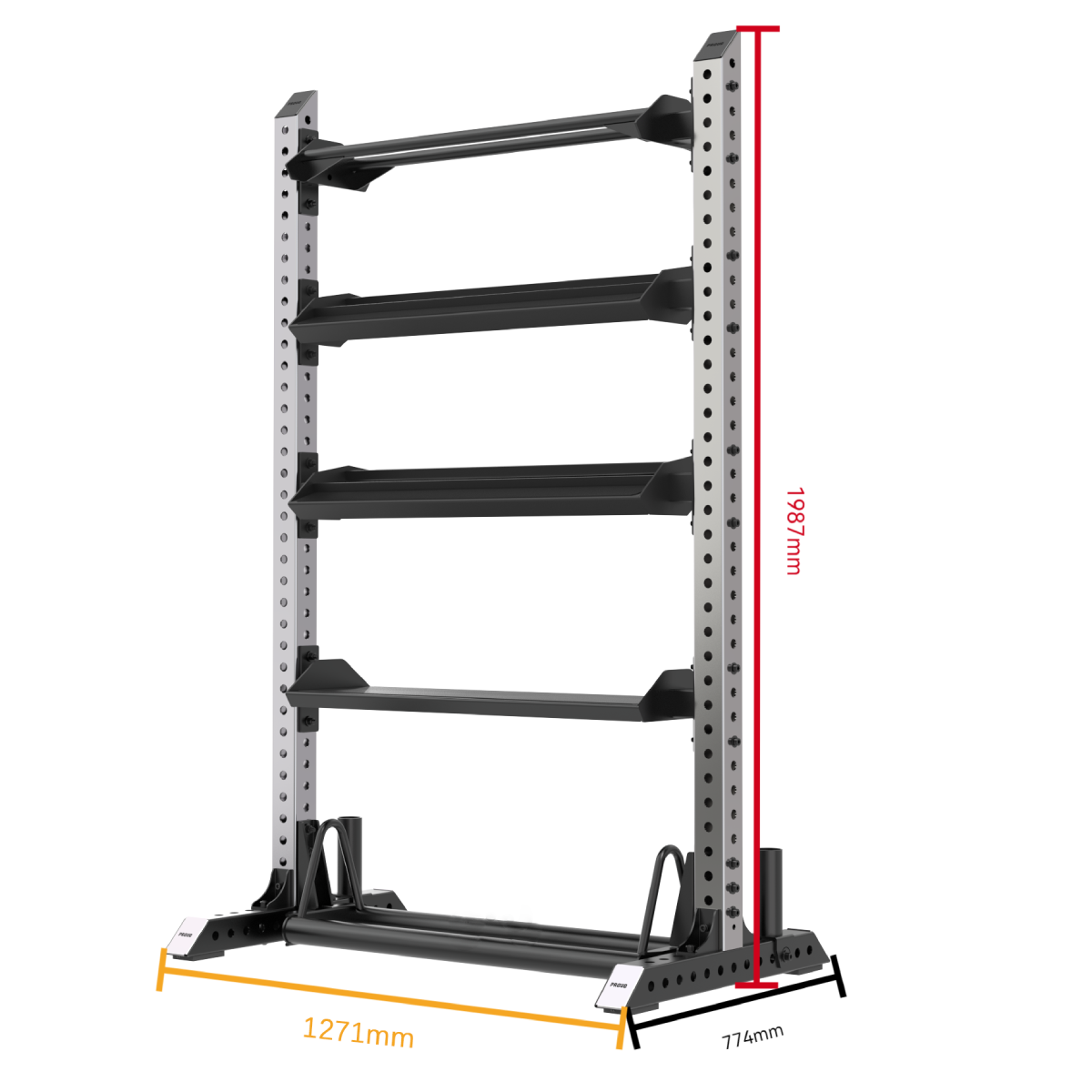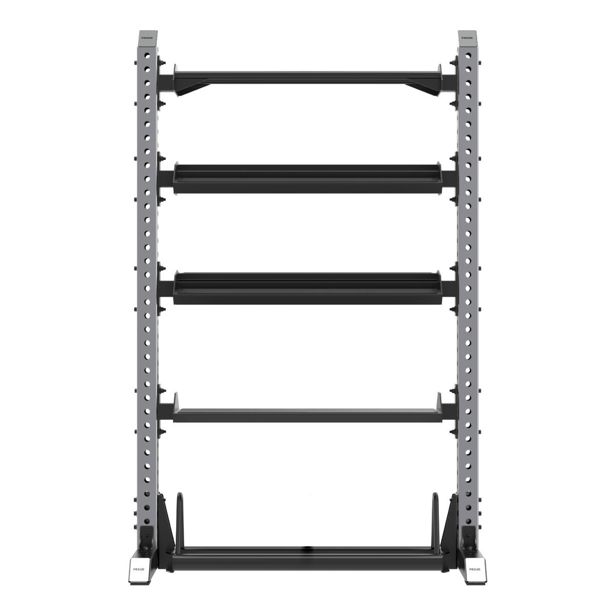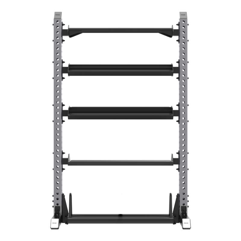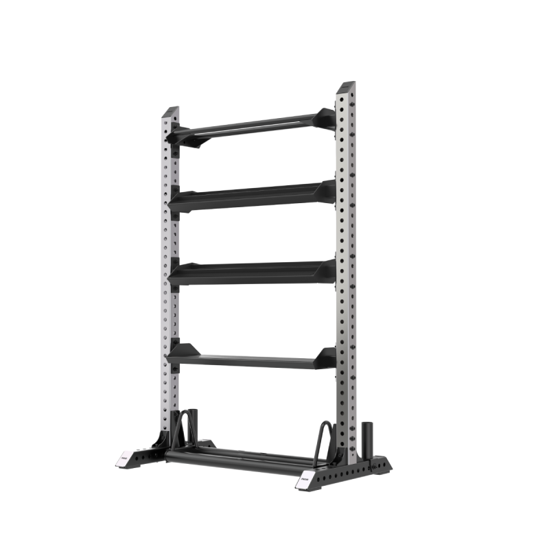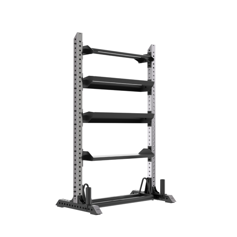 Konstrukcja wyposażona jest w półkę na obciążenia olimpijskie, 2 uniwersalne półki na hantle, płaską półkę na kettle lub akcesoria treningowe i półkę na piłki typu wall ball/slam ball. Wszystkie półki wykonane są ze stali i pokryte trwałą farbą proszkową w kolorze czarny mat. Profilowane gniazda półek zapewniają stabilne i bezpieczne odkładanie hantli, również w warunkach intensywnego użytkowania komercyjnego.