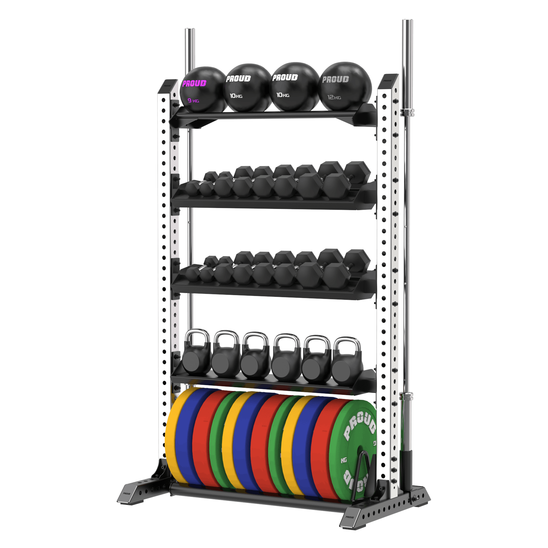 Oferta obejmuje prekonfigurowane stojaki, odpowiadające najczęściej spotykanym potrzebom organizacyjnym w klubach fitness. Dla najbardziej wymagających klientów dostępny jest również konfigurator PROUD EDGE, umożliwiający stworzenie stojaka dokładnie dopasowanego do konkretnego układu sali i sposobu użytkowania sprzętu. System pozwala na dowolny dobór półek, wieszaków, trzpieni na obciążenia oraz innych akcesoriów, dzięki czemu inwestor może zaprojektować ergonomiczne, spójne i bezpieczne strefy treningowe.